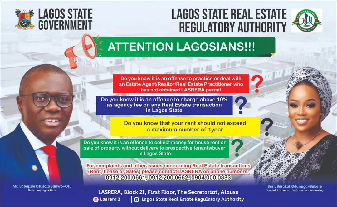 If you live, rent, buy, sell, or invest in property within Lagos State, this is a must-read. The Lagos State Government through the Lagos State Real Estate Regulatory Authority (LASRERA) has made it clear — real estate in Lagos is now a regulated market, and ignorance of the law is no longer an excuse.Let’s break it down for you: